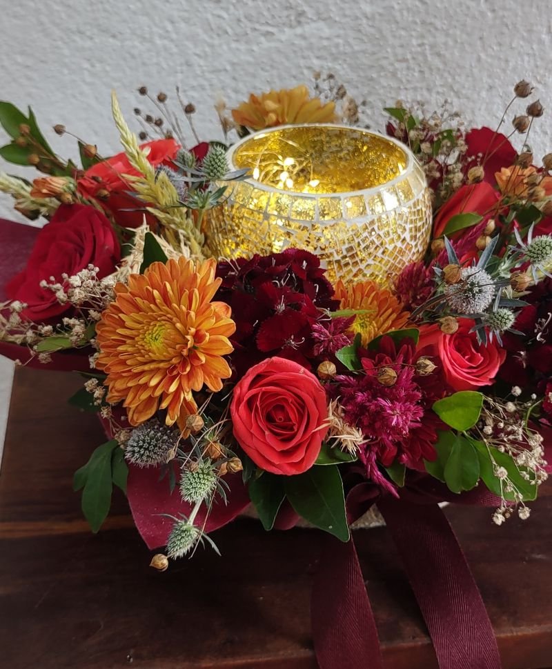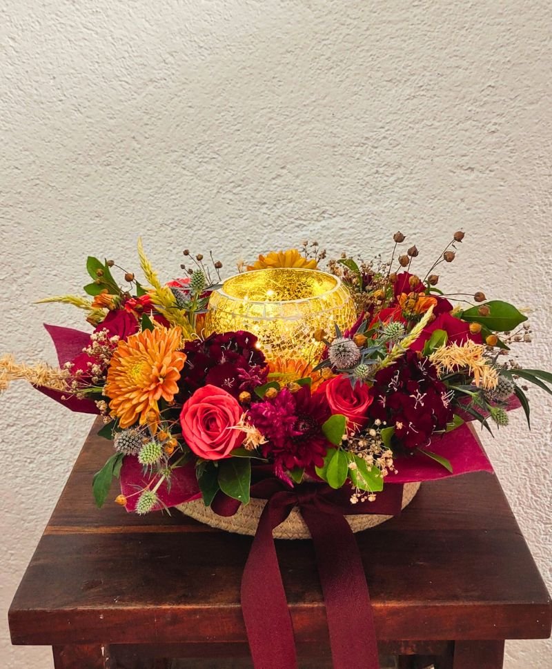 Breathtaking arrangement in a round jute basket, beautifully adorned with red lace. At its heart rests a glass golden diya, surrounded by a vibrant medley of flowers in shades of orange and red, featuring roses, chrysanthemums, celosia, and touches of dry flowers. This radiant display serves as a stunning centerpiece, blending festive charm and natural beauty, perfect for brightening any occasion.