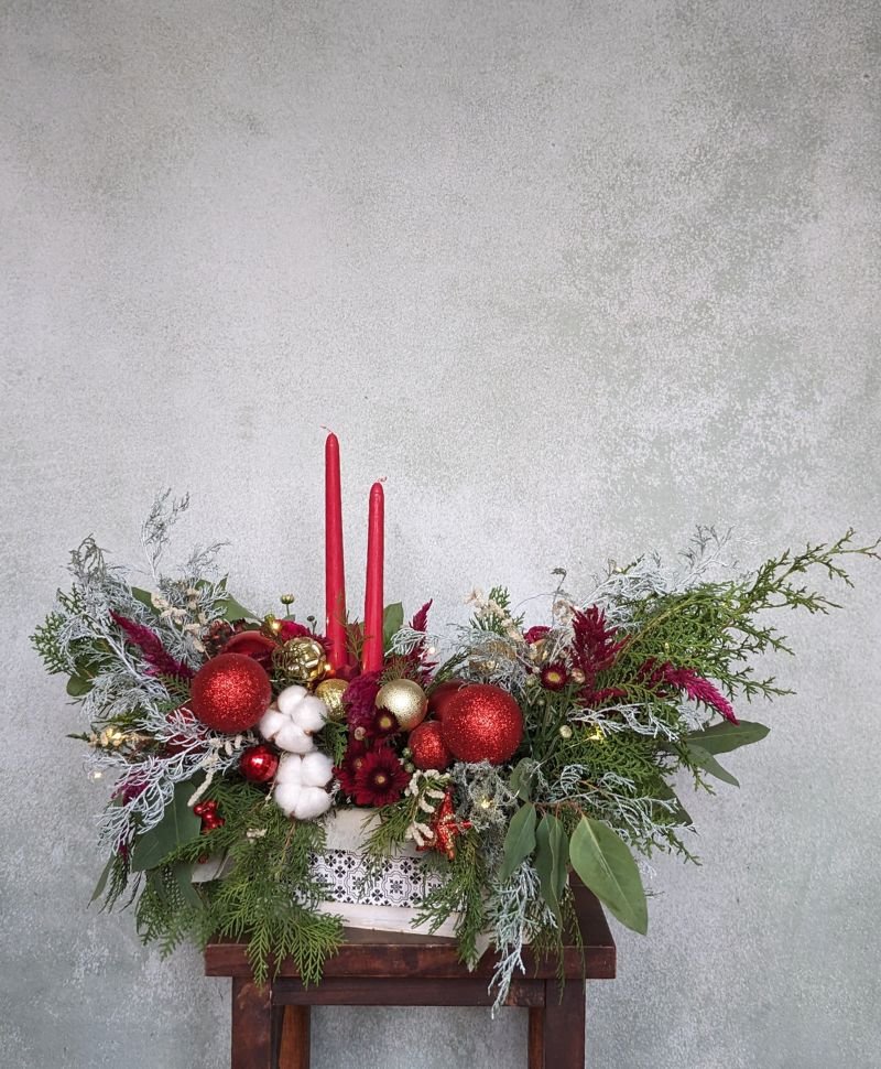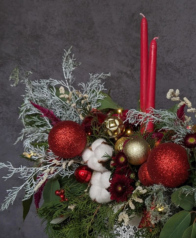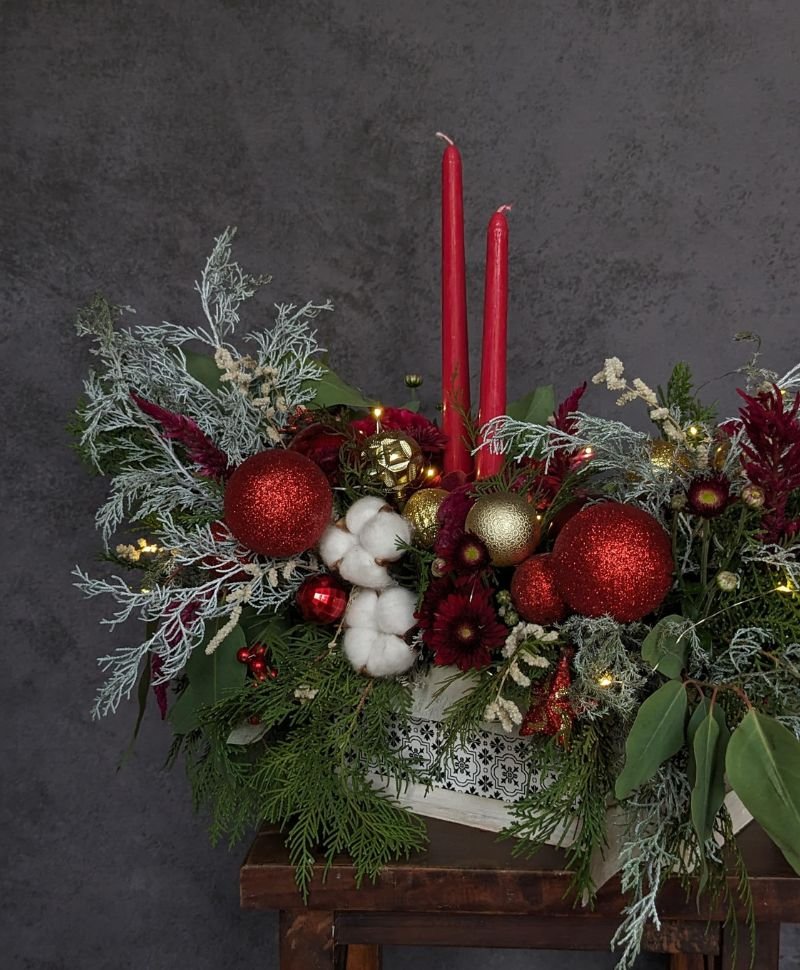 The arrangement contains a variety of green and sprayed white leaves, red flowers such as chrysanthemums, roses, carnations, celosia, and others with an assortment of baubles and fragrant candles.