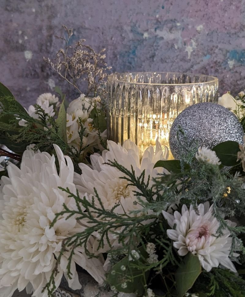 Immerse yourself in the tranquil beauty of winter with “Frosted Harmony”. This enchanting arrangement combines delicate white blooms, reminiscent of freshly fallen snow, elegantly arranged in a rustic jute basket. A graceful candle holder at its center casts a soft, luminous glow, creating a serene ambiance. Perfect for celebrating the season’s quiet magic, this piece embodies the peaceful harmony of a frosty winter’s eve.