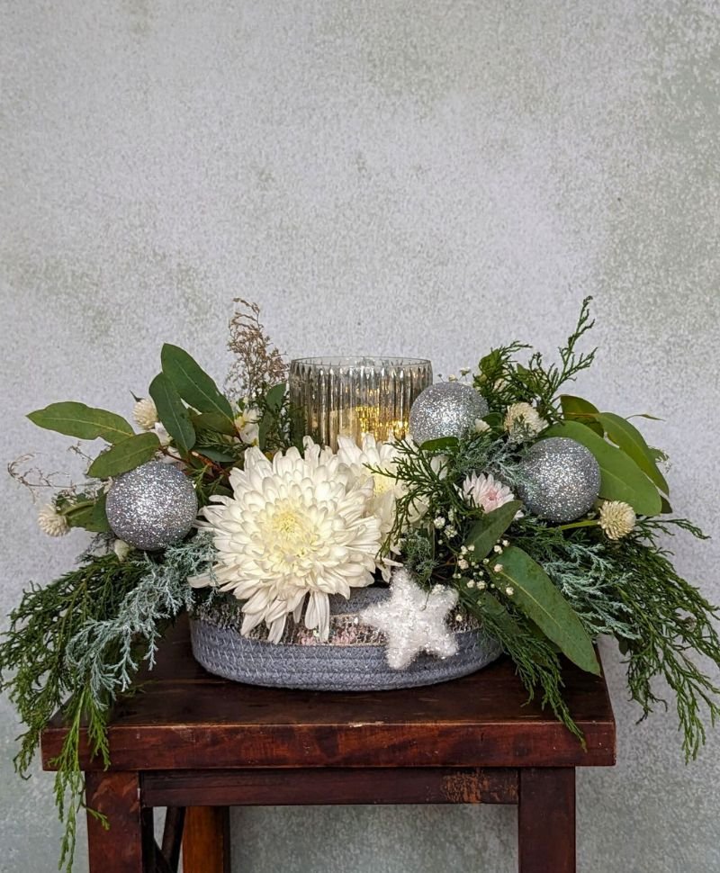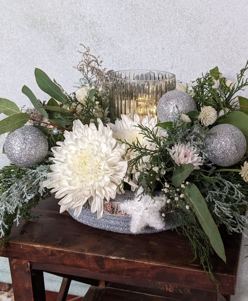 Arrangement in a jute basket with the candleholder in the center; features chrysanthemums, roses, carnations, gomphrena, and other seasonal flowers and fillers decorated with baubles and Christmas ornaments and battery-operated light.