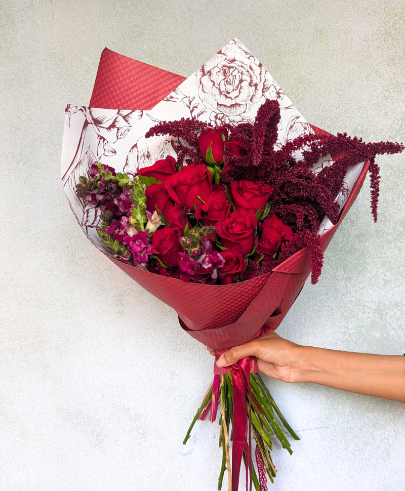 Love in Bloom is a heartfelt expression of romance and warmth, thoughtfully arranged to capture the beauty of meaningful moments. Featuring rich red roses nestled among textured seasonal blooms in deep berry tones, this bouquet radiates passion, elegance, and affection. Wrapped in complementary tones and finished with refined detailing, it’s designed to feel both classic and contemporary.