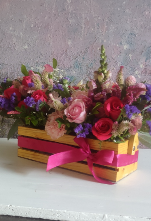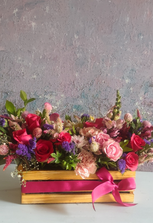 Immerse yourself in a burst of vibrant hues with our enchanting composition in a wooden crate. Radiant shades of pink and purple flowers dance harmoniously within, creating a captivating symphony of color. This lively display exudes energy and charm, making it the perfect gift for any occasion. Let the vivid blooms in bright hues uplift your space and bring joy to your loved ones.
