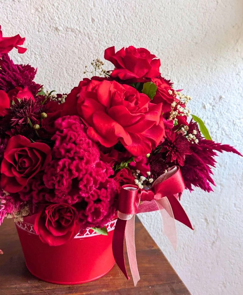 The arrangement is in a red container containing red roses, red chrysanthemum, celosia, and a feather celosia adorned with baby’s breath and playful bow.