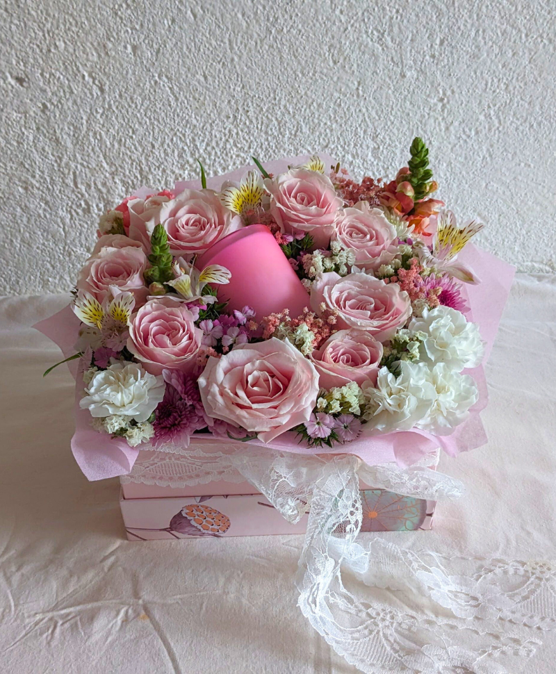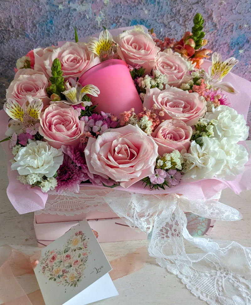 Sweet Embrace is a gentle expression of warmth, affection, and thoughtful care. Designed in soft blush tones, this charming arrangement features delicate roses paired with complementary seasonal blooms, beautifully nestled in an elegant keepsake box. A pastel candle at its heart adds a comforting, intimate touch, while lace detailing completes the look with subtle sophistication.