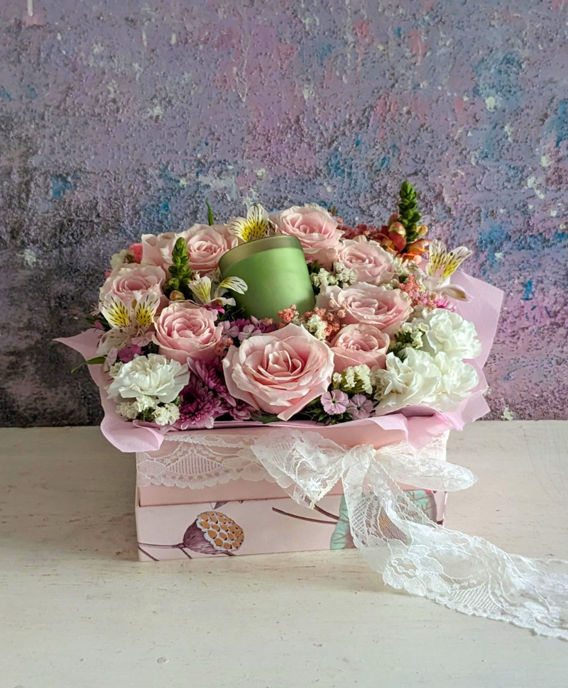The arrangement in a box with a scented Niana candle in the centre, on a bed of flowers, such as roses, carnations, chrysanthemum, and other fresh seasonal flowers and fillers.